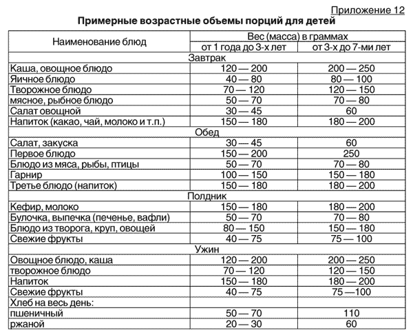 Примерные возрастные объемы порций для ребенка
